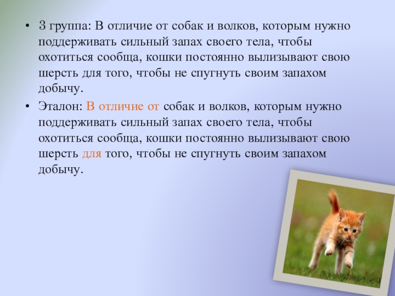 Эталон: В отличие от собак и волков, которым нужно поддерживать сильный запах своего тела, чтобы охотиться сообща, кошки постоянно вылизывают свою шерсть для того, чтобы не спугнуть своим запахом добычу.