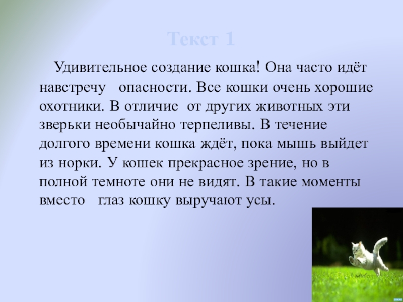 навстречу опасности. Все кошки очень хорошие охотники. В отличие от других животных эти зверьки необычайно терпеливы. В течение долгого времени кошка ждёт, пока мышь выйдет из норки. У кошек прекрасное зрение, но в полной темноте они не видят. В такие моменты вместо глаз кошку выручают усы.