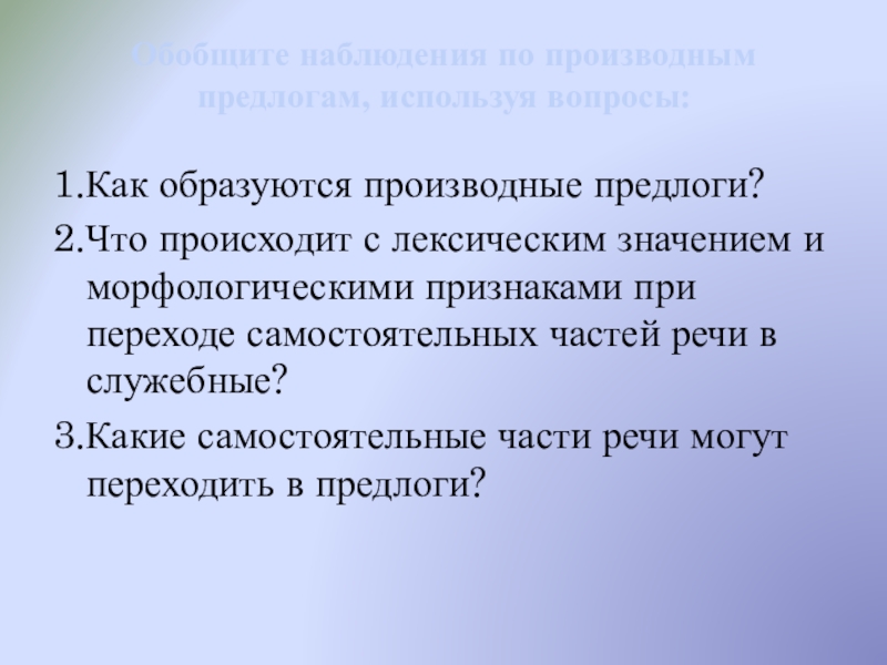 Обобщите наблюдения по производным предлогам, используя вопросы: