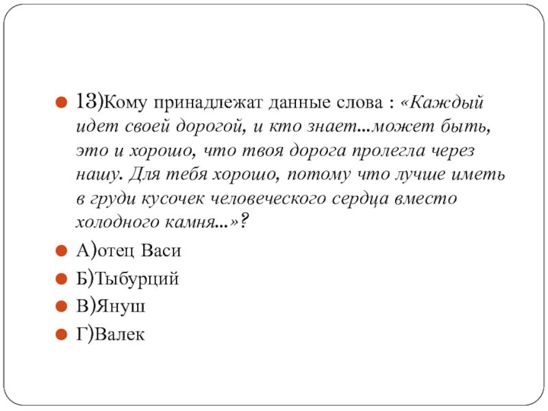 Слайд 2413)Кому принадлежат данные слова : «Каждый идет своей дорогой, и кто