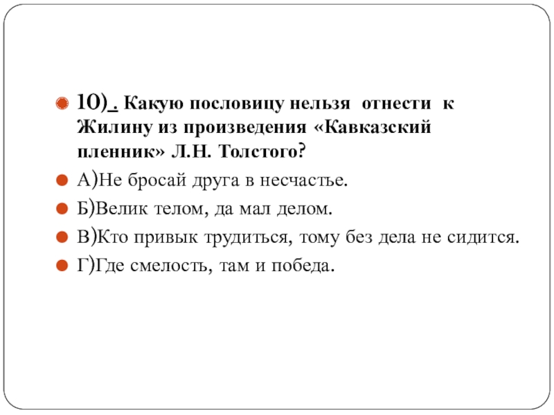 Слайд 2110) . Какую пословицу нельзя отнести к Жилину из произведения «Кавказский