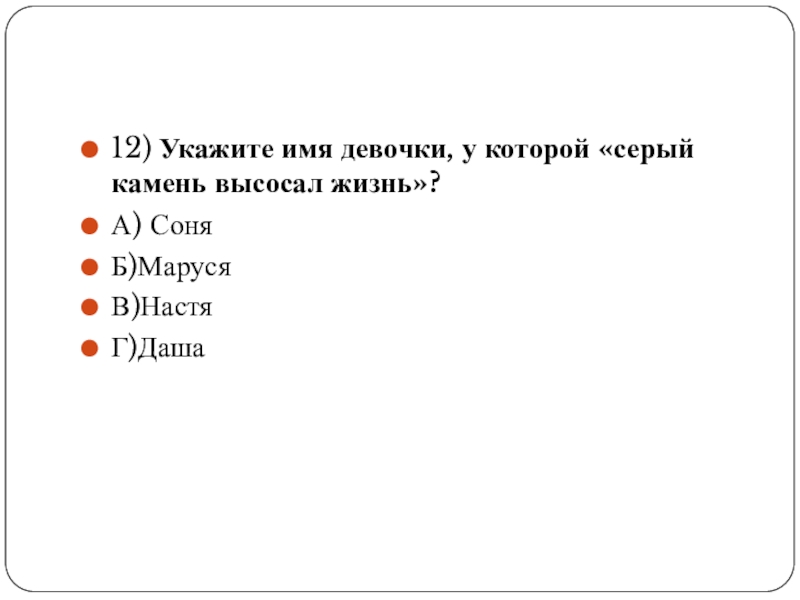 Слайд 2312) Укажите имя девочки, у которой «серый камень высосал жизнь»?