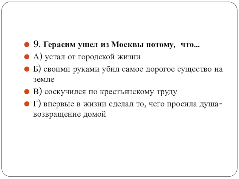 Слайд 209. Герасим ушел из Москвы потому, что…