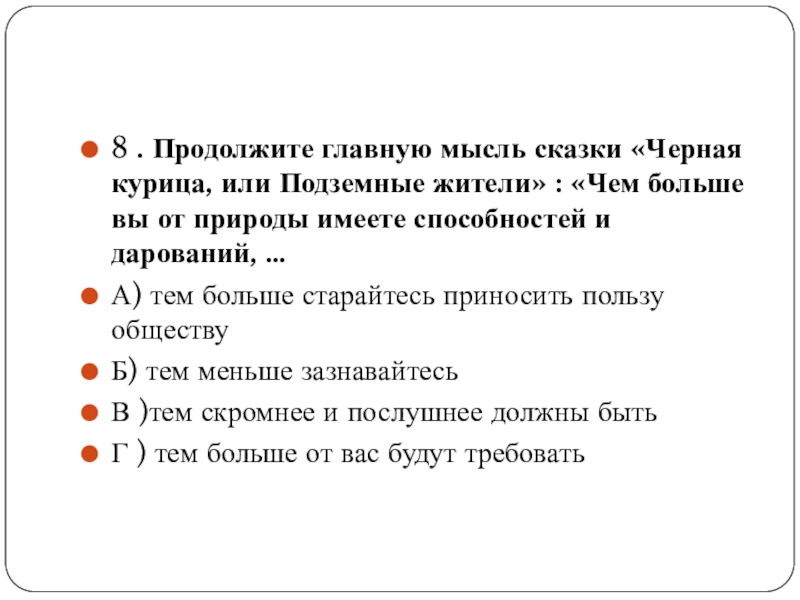 Слайд 198 . Продолжите главную мысль сказки «Черная курица, или Подземные жители»