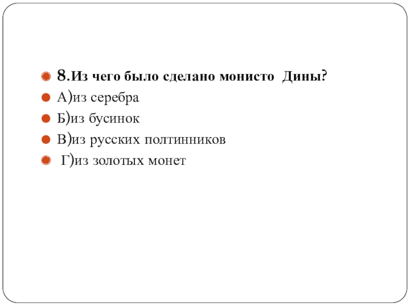 Слайд 98.Из чего было сделано монисто Дины?