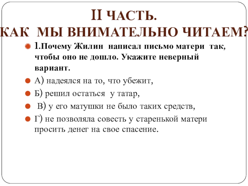 Слайд 121.Почему Жилин написал письмо матери так, чтобы оно не дошло. Укажите