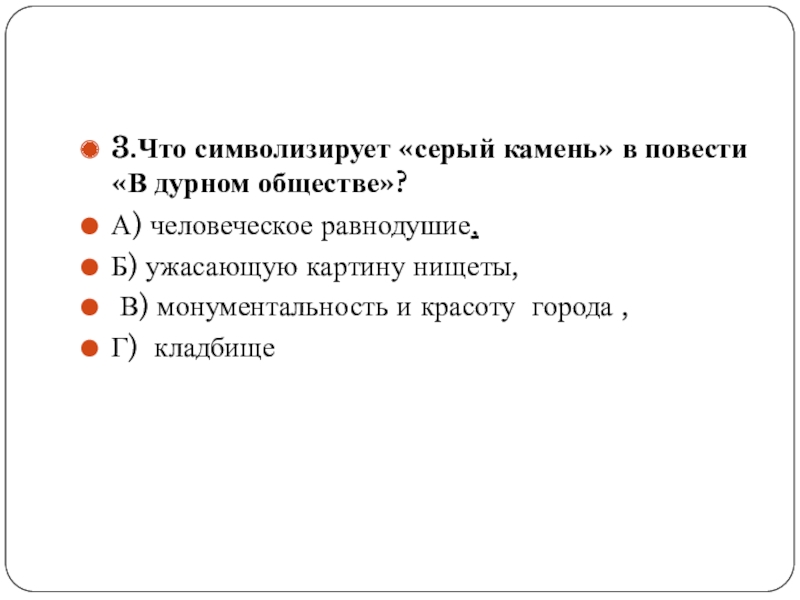 Слайд 143.Что символизирует «серый камень» в повести «В дурном обществе»?