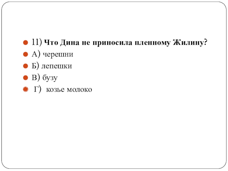 Слайд 2211) Что Дина не приносила пленному Жилину?