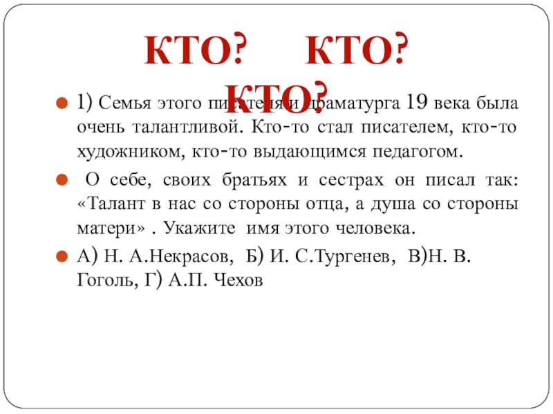 А) Н. А.Некрасов, Б) И. С.Тургенев, В)Н. В.Гоголь, Г) А.П. Чехов