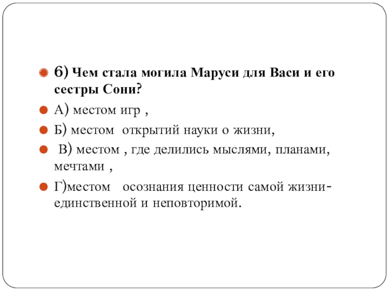 Слайд 176) Чем стала могила Маруси для Васи и его сестры Сони?