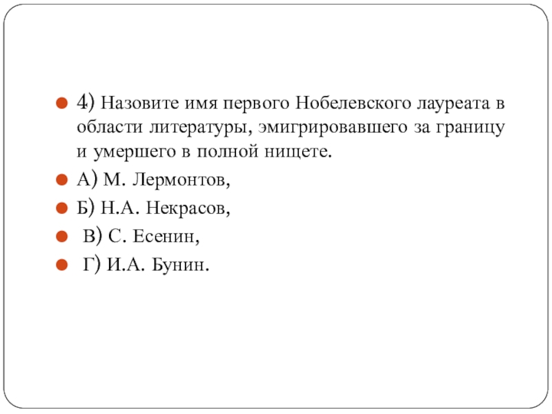 Слайд 54) Назовите имя первого Нобелевского лауреата в области литературы, эмигрировавшего за