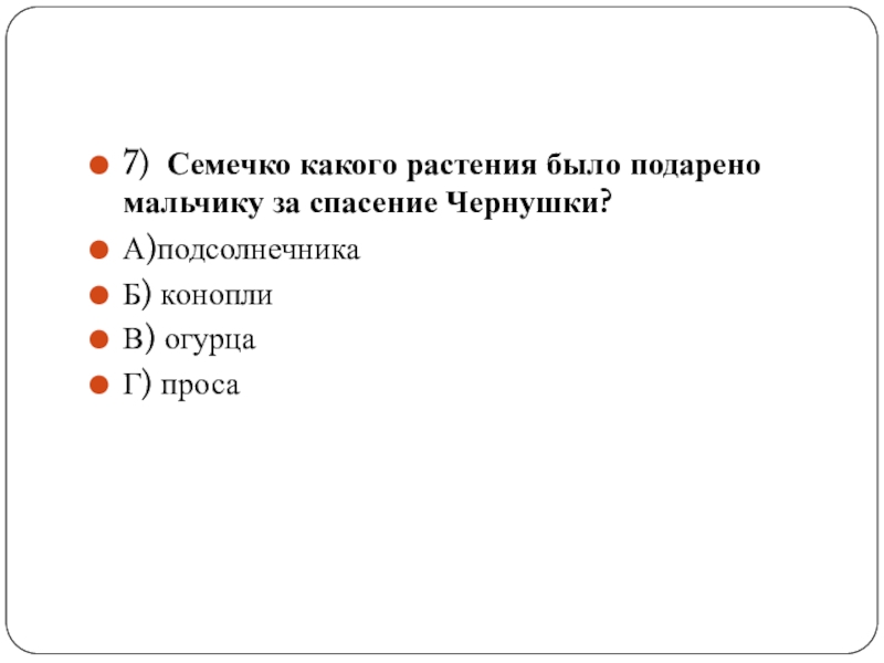 Слайд 187) Семечко какого растения было подарено мальчику за спасение Чернушки?
