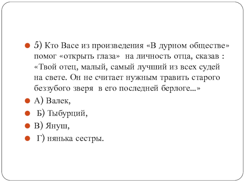 Слайд 165) Кто Васе из произведения «В дурном обществе» помог «открыть глаза»