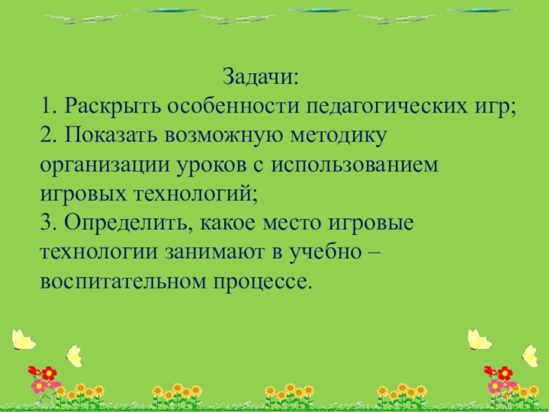 Задачи: 1. Раскрыть особенности педагогических игр; 2. Показать возможную методику организации уроков с использованием игровых технологий; 3. Определить, какое место игровые технологии занимают в учебно – воспитательном процессе.