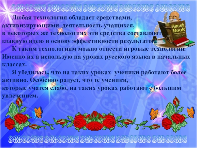 Любая технология обладает средствами,активизирующими деятельность учащихся, в некоторых же технологиях эти средства составляютглавную идею и основу эффективности результатов. К таким технологиям можно отнести игровые технологии. Именно их я использую на уроках русского языка в начальных классах. Я убедилась,