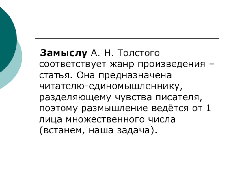Слайд 19 Замыслу А. Н. Толстого соответствует жанр произведения – статья.