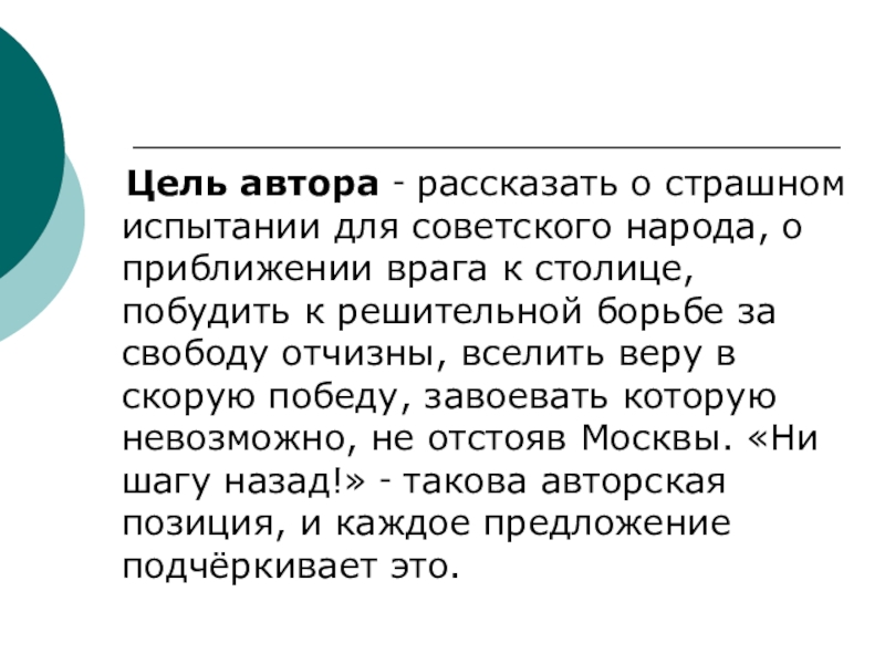 народа, о приближении врага к столице, побудить к решительной борьбе за свободу отчизны, вселить веру в скорую победу, завоевать которую невозможно, не отстояв Москвы. «Ни шагу назад!» ‑ такова авторская позиция, и каждое предложение подчёркивает это.