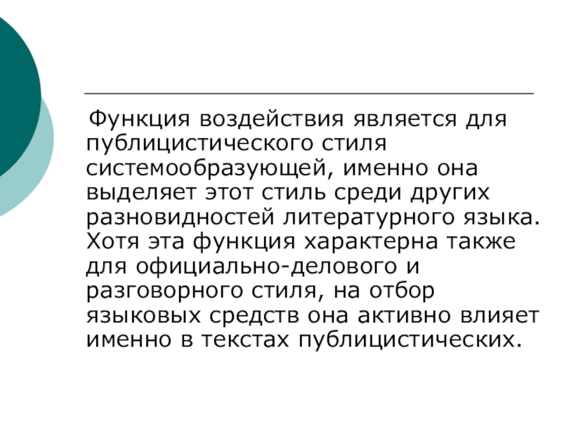 выделяет этот стиль среди других разновидностей литературного языка. Хотя эта функция характерна также для официально-делового и разговорного стиля, на отбор языковых средств она активно влияет именно в текстах публицистических.