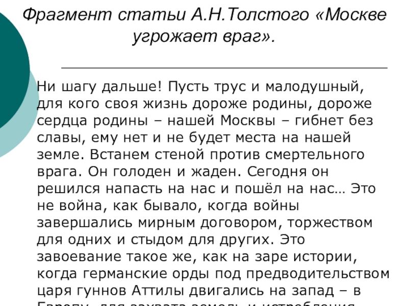 Слайд 16Фрагмент статьи А.Н.Толстого «Москве угрожает враг».