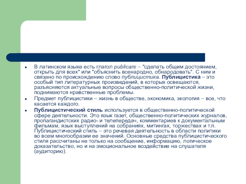 Публицистический стиль используется в общественно-политической сфере деятельности. Это язык газет, общественно-политических журналов, пропагандистских радио- и телепередач, комментариев к документальным фильмам, язык выступлений на собраниях, митингах, торжествах и т.п. Публицистический стиль – это речевая деятельность в области политики во всем многообразии ее значений. Основные средства публицистического стиля рассчитаны не только на сообщение, информацию, логическое доказательство, но и на эмоциональное воздействие на слушателя (аудиторию).