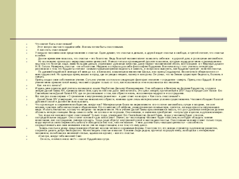 Но постепенно произошло переосмысление ценностей. Я много читала произведений русских классиков, которые подводили меня к размышлению над тем, что богатые люди, имея большие деньги, утрачивают духовные качества, даже теряют человеческий облик, как Плюшкин в « Мертвых душах» Н. В. Гоголя. Наверное, счастье - не в богатстве. Недавно я открыла для себя философию буддизма. Все началось с того: учитель литературы рассказала о том, что буддисты считают самым страшным грехом жадность и зависть, и попросила выяснить, как буддизм трактует понятие счастья.
