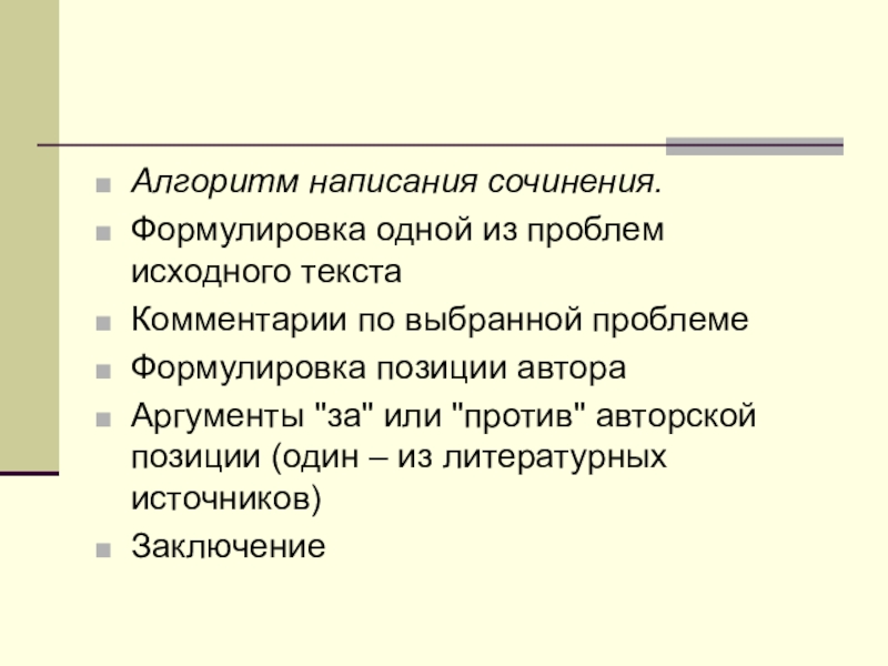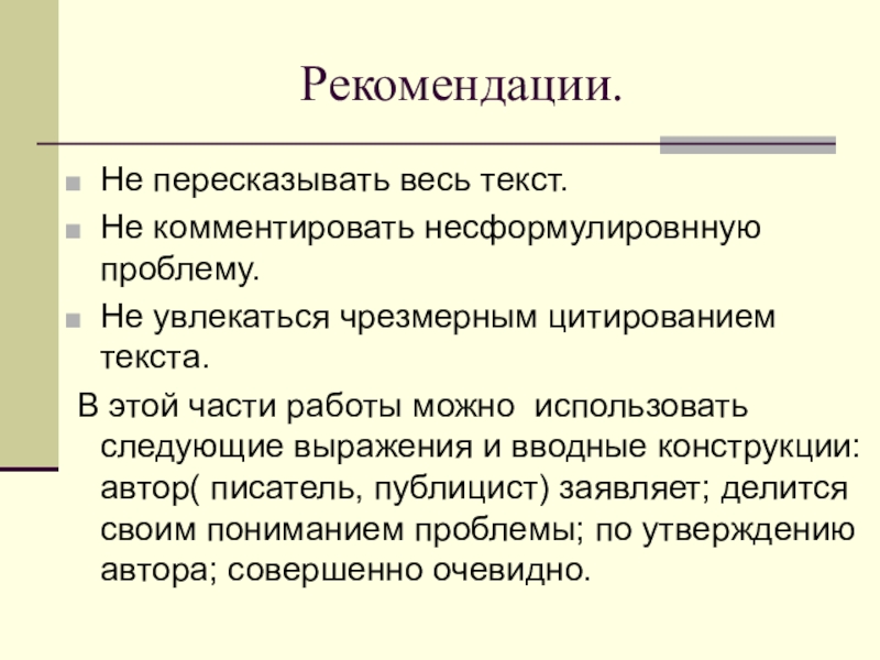 В этой части работы можно использовать следующие выражения и вводные конструкции: автор( писатель, публицист) заявляет; делится своим пониманием проблемы; по утверждению автора; совершенно очевидно.