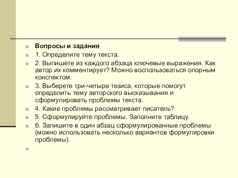 3. Выберете три-четыре тезиса, которые помогут определить тему авторского высказывания и сформулировать проблемы текста.