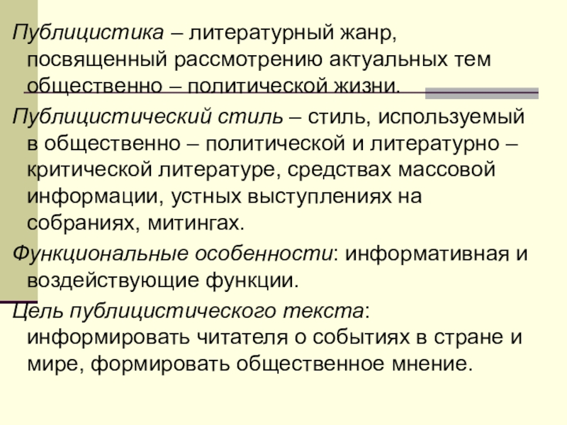 Публицистический стиль – стиль, используемый в общественно – политической и литературно – критической литературе, средствах массовой информации, устных выступлениях на собраниях, митингах.