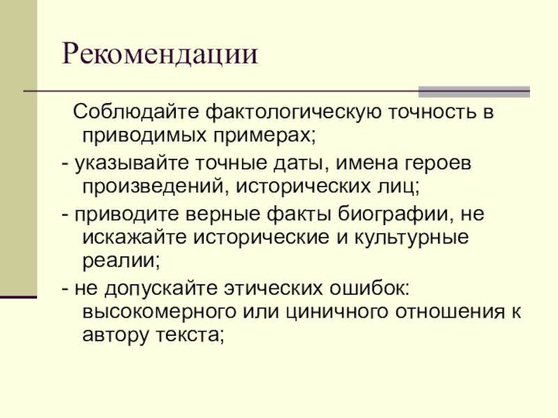 - приводите верные факты биографии, не искажайте исторические и культурные реалии;