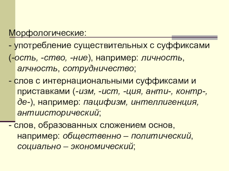 слов с интернациональными суффиксами и приставками (-изм, -ист, -ция, анти-, контр-, де-), например: пацифизм, интеллигенция, антиисторический;