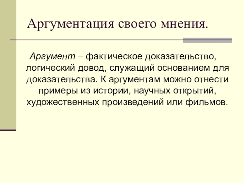 Аргумент – фактическое доказательство, логический довод, служащий основанием для