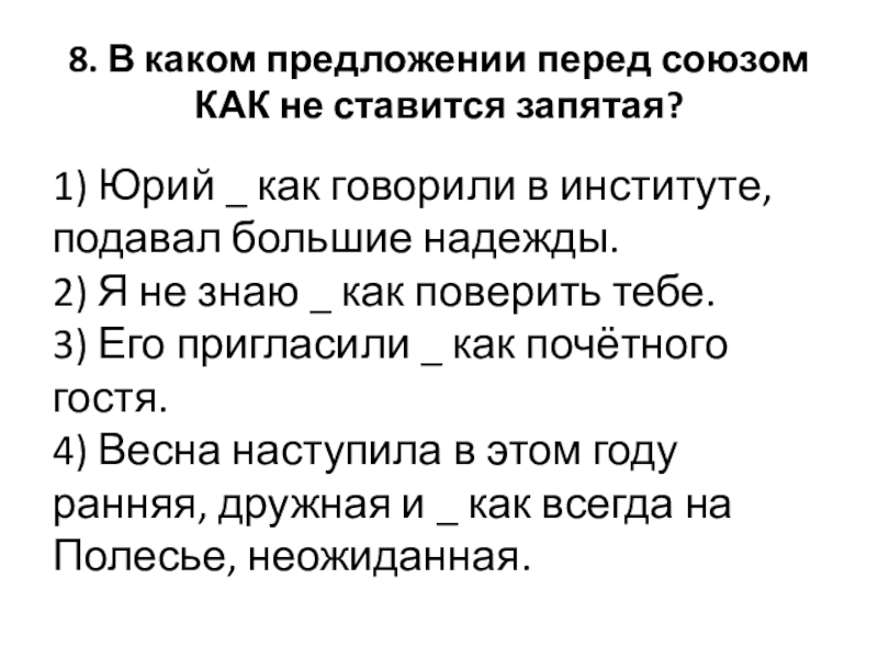 Слайд 43. В каком предложении перед союзом КАК ставится запятая?
