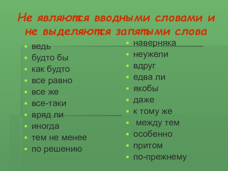 Слайд 10Не являются вводными словами и не выделяются запятыми слова
