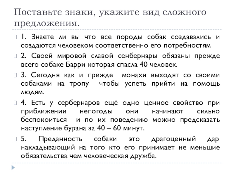 Поставьте знаки, укажите вид сложного предложения.1. Знаете ли вы что все породы собак создавались и создаются человеком соответственно его потребностям2. Своей мировой славой сенбернары обязаны прежде всего собаке Барри которая спасла 40 человек.3. Сегодня как и