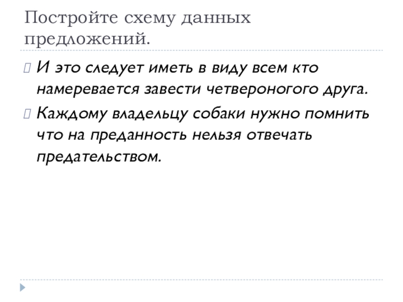 Постройте схему данных предложений. И это следует иметь в виду всем кто намеревается завести четвероногого друга.Каждому владельцу