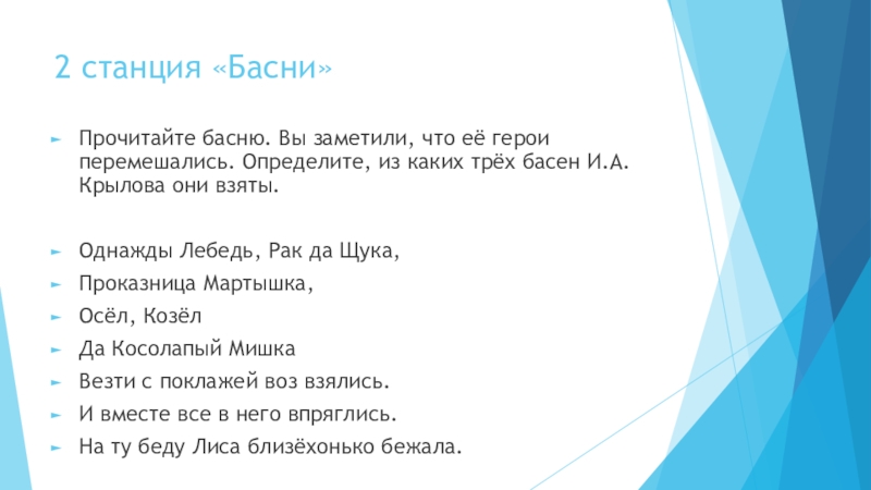 2 станция «Басни» Прочитайте басню. Вы заметили, что её герои перемешались. Определите, из каких трёх басен И.А.