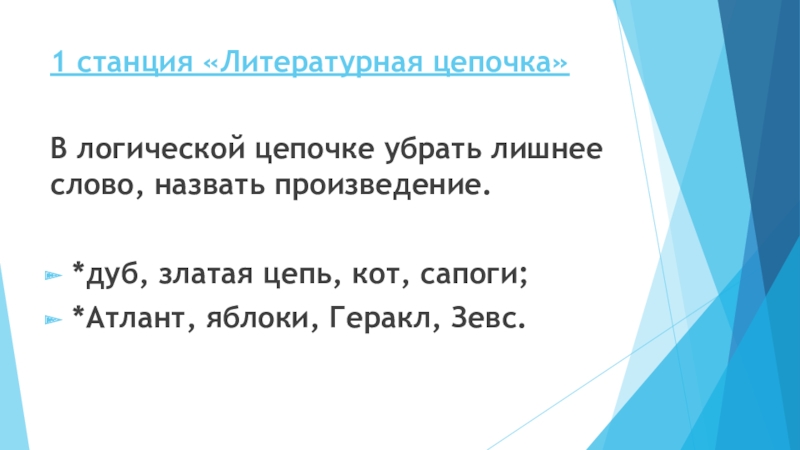 1 станция «Литературная цепочка» В логической цепочке убрать лишнее слово, назвать произведение.*дуб, златая цепь, кот, сапоги;*Атлант, яблоки, Геракл, Зевс.