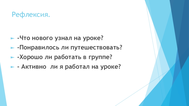 Рефлексия. -Что нового узнал на уроке?-Понравилось ли путешествовать?-Хорошо ли работать в группе?- Активно ли я работал на
