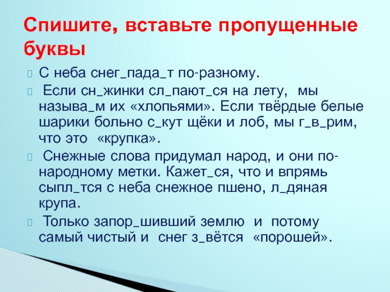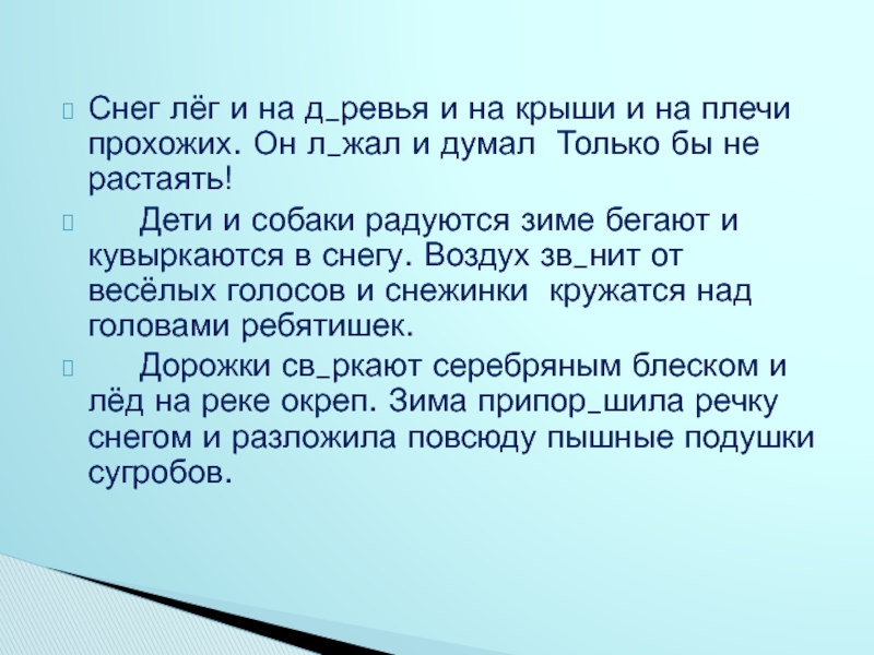 Слайд 28Снег лёг и на д_ревья и на крыши и на плечи