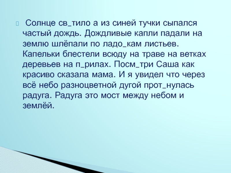 капли падали на землю шлёпали по ладо_кам листьев. Капельки блестели всюду на траве на ветках деревьев на п_рилах. Посм_три Саша как красиво сказала мама. И я увидел что через всё небо разноцветной дугой прот_нулась радуга. Радуга это мост между небом и землёй.