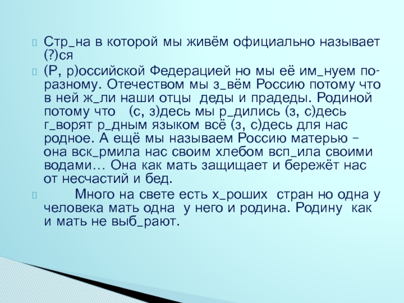 мы её им_нуем по-разному. Отечеством мы з_вём Россию потому что в ней ж_ли наши отцы деды и прадеды. Родиной потому что (с, з)десь мы р_дились (з, с)десь г_ворят р_дным языком всё (з, с)десь для нас родное. А ещё мы называем Россию матерью – она вск_рмила нас своим хлебом всп_ила своими водами… Она как мать защищает и бережёт нас от несчастий и бед.