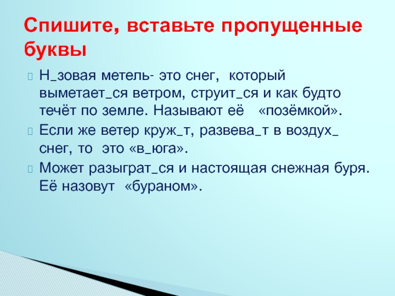 Слайд 15Н_зовая метель- это снег, который выметает_ся ветром, струит_ся и как будто
