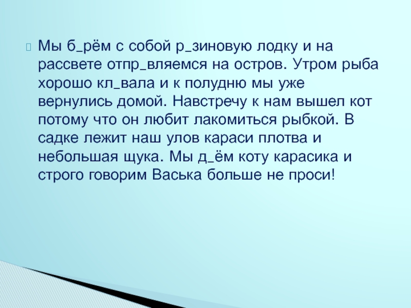 остров. Утром рыба хорошо кл_вала и к полудню мы уже вернулись домой. Навстречу к нам вышел кот потому что он любит лакомиться рыбкой. В садке лежит наш улов караси плотва и небольшая щука. Мы д_ём коту карасика и строго говорим Васька больше не проси!