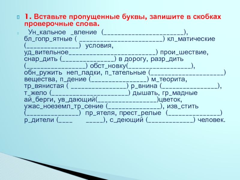 _вление (_______________________), бл_гопр_ятные ( ________________________) кл_матические (_______________) условия, уд_вительное_________________________) прои_шествие, снар_дить (_______________) в дорогу, разр_дить(_________________) обст_новку(__________________), обн_ружить неп_ладки, п_тательные (_____________________) вещества, п_дение (________________) м_теорита,тр_вянистая ( ________________) р_внина (________________), т_жело (______________________) дышать, гр_мадные ай_берги, ув_дающий(_________________)цветок,ужас_ноеземл_тр_сение (_______________), изв_стить (_______________) пр_ятеля, прест_релые (_______________) р_дители (____ _____), с_деющий (_____________) человек.