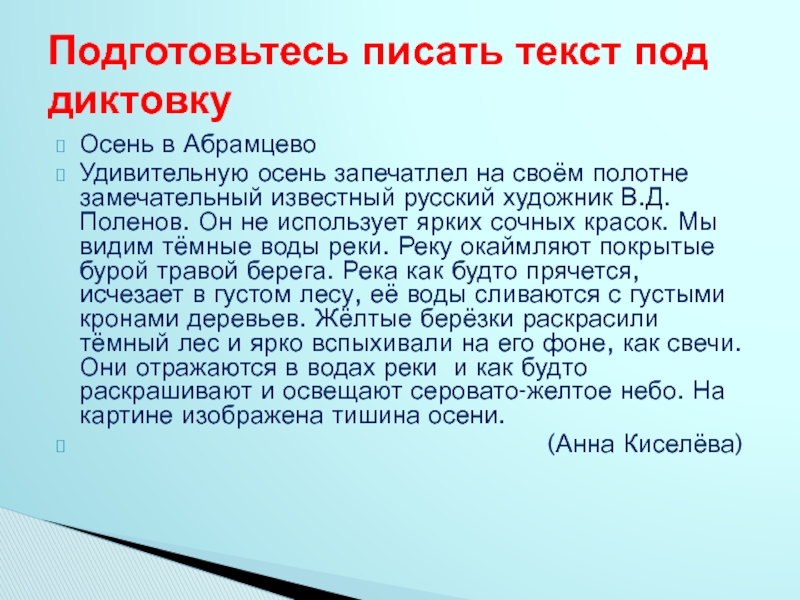 художник В.Д. Поленов. Он не использует ярких сочных красок. Мы видим тёмные воды реки. Реку окаймляют покрытые бурой травой берега. Река как будто прячется, исчезает в густом лесу, её воды сливаются с густыми кронами деревьев. Жёлтые берёзки раскрасили тёмный лес и ярко вспыхивали на его фоне, как свечи. Они отражаются в водах реки и как будто раскрашивают и освещают серовато-желтое небо. На картине изображена тишина осени.
