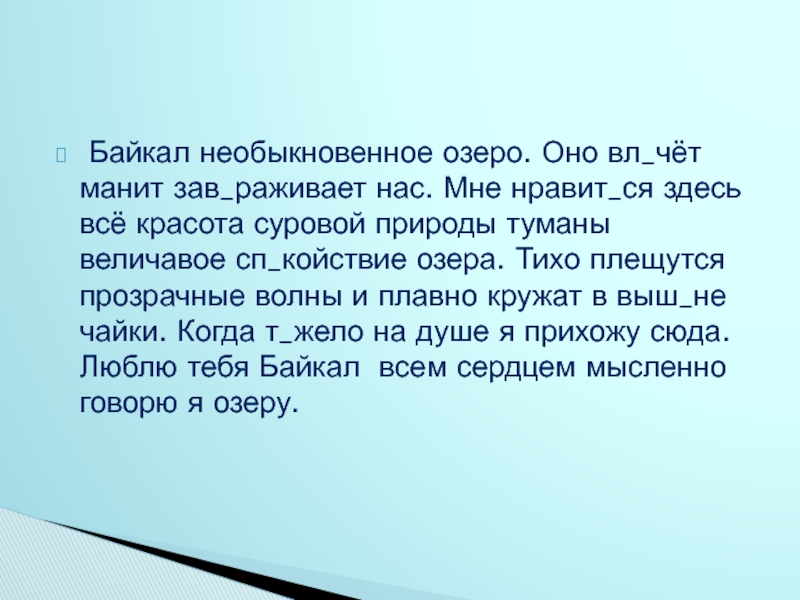 Слайд 26 Байкал необыкновенное озеро. Оно вл_чёт манит зав_раживает нас. Мне нравит_ся