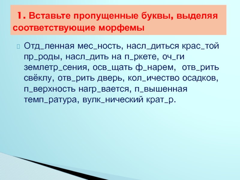 Слайд 5Отд_ленная мес_ность, насл_диться крас_той пр_роды, насл_дить на п_ркете, оч_ги землетр_сения, осв_щать