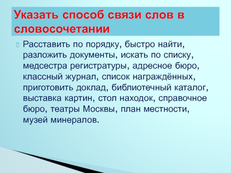 регистратуры, адресное бюро, классный журнал, список награждённых, приготовить доклад, библиотечный каталог, выставка картин, стол находок, справочное бюро, театры Москвы, план местности, музей минералов.