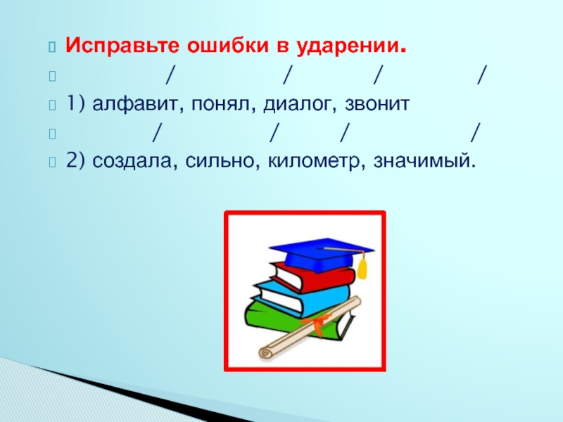 Слайд 17Исправьте ошибки в ударении.