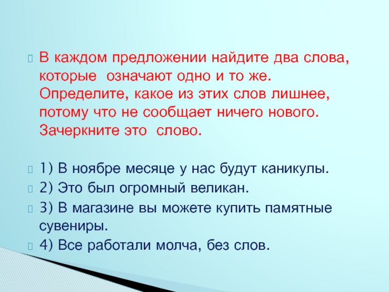 же. Определите, какое из этих слов лишнее, потому что не сообщает ничего нового. Зачеркните это слово.